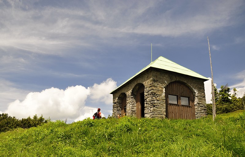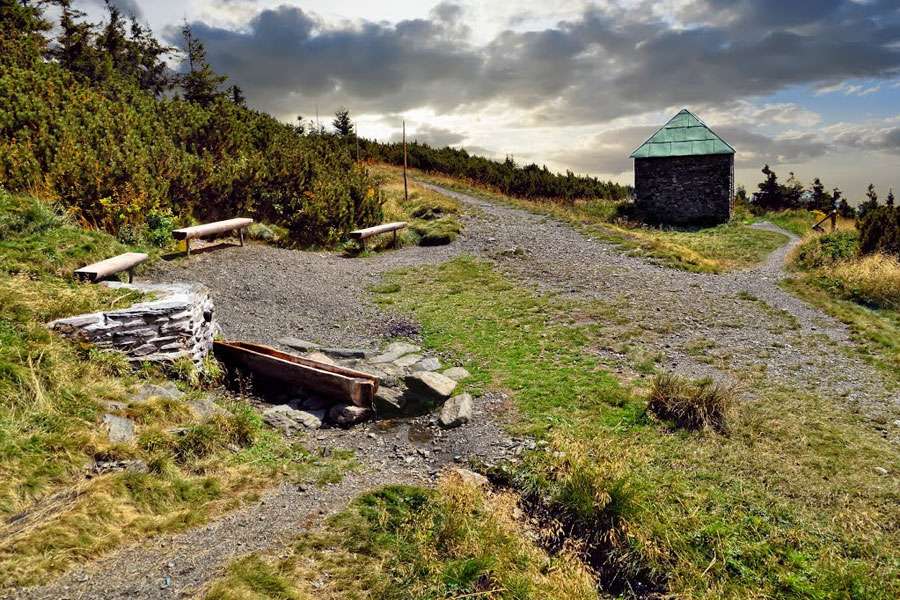 Jelení studánka (cca 7 km od chaty) Pokračujete po hřebeni, kde stromy ustupují horským loukám (holím). Cesta k Jelení studánce je už mírnější a nabídne vám pocit svobody. U studánky vyvěrá křišťálově čistý pramen Stříbrného potoka a stojí zde kamenný útulek, kde si můžete odpočinout ve stínu.